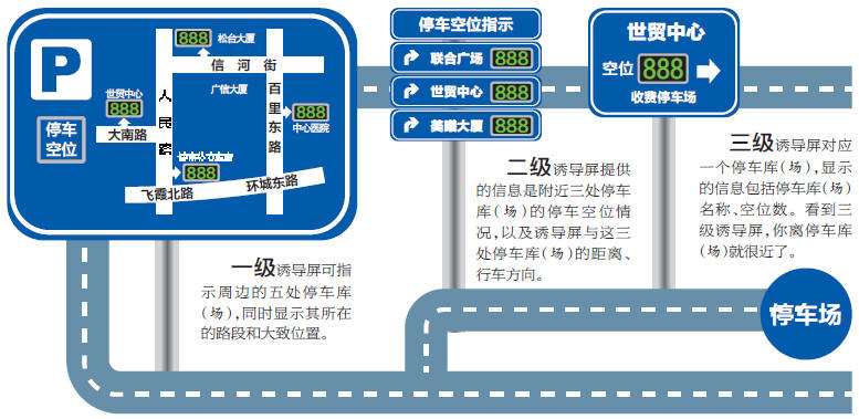 城市停車誘導(dǎo)屏是城市停車誘導(dǎo)系統(tǒng)的重要組成部分,?主要用于實(shí)時(shí)顯示停車場的車位信息,?引導(dǎo)駕駛者便捷停車?。? 這類屏幕通常分為一級、?二級和三級誘導(dǎo)屏。?一級誘導(dǎo)屏主要分布在交通主干道上,?顯示附近周邊停車場數(shù)量及初步的停車數(shù)據(jù);?二級誘導(dǎo)屏設(shè)置在次要干道上,?顯示路邊停車位及附近停車場現(xiàn)存的車位數(shù)量;?三級誘導(dǎo)屏則設(shè)置在每個(gè)停車場的進(jìn)出口處,?實(shí)時(shí)通過閘道口感應(yīng)將收集的數(shù)據(jù)顯現(xiàn)在屏幕上。? 城市停車誘導(dǎo)屏的應(yīng)用有助于調(diào)節(jié)停車需求,?提高停車設(shè)施使用率,?減少因?qū)ふ彝\噲龆a(chǎn)生的道路交通,?提高整個(gè)交通系統(tǒng)的效率。